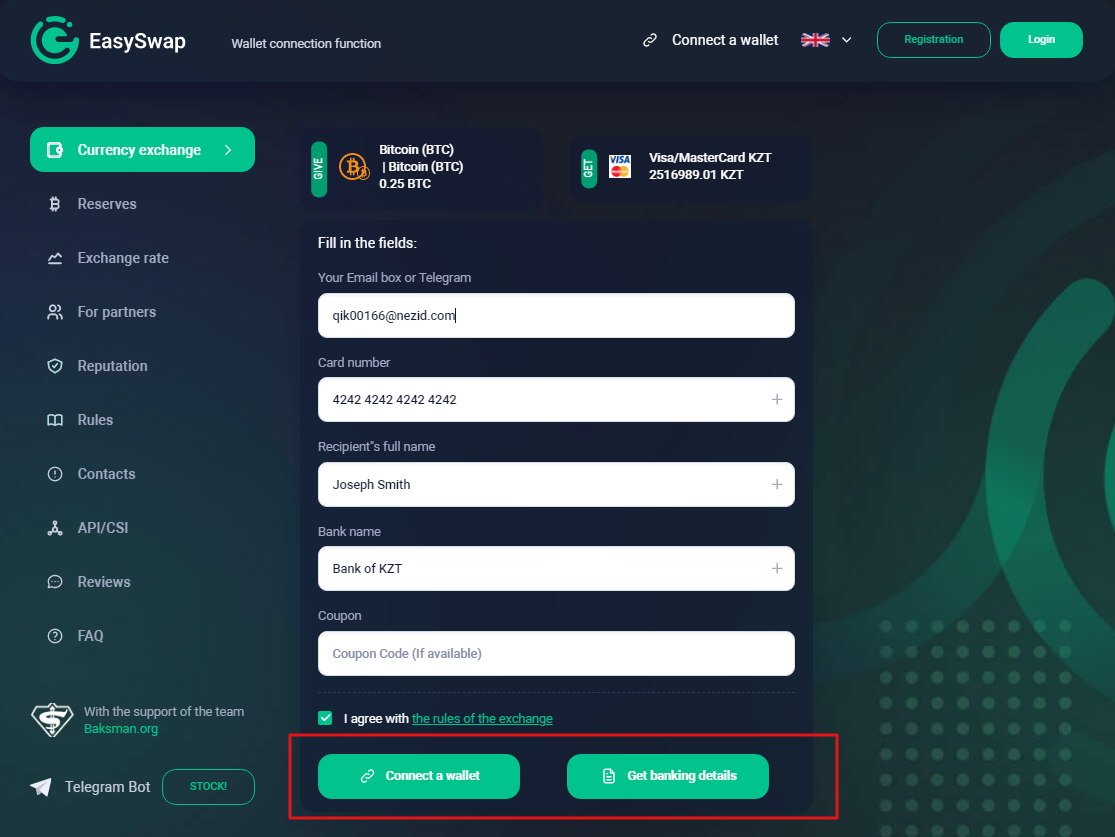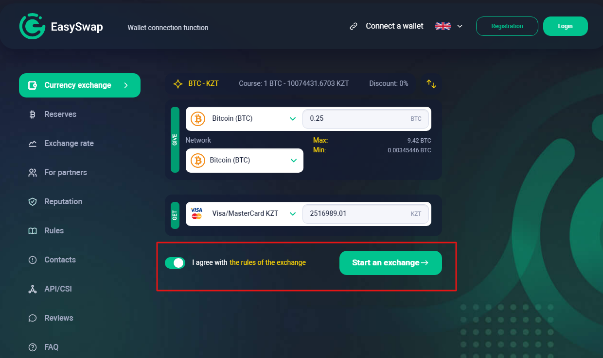 Click "Start exchange", which will mean your agreement with the exchange rules. Please familiarize yourself with them in advance;